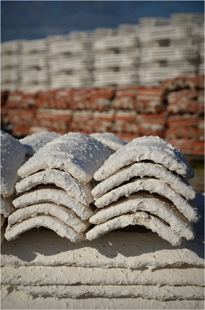 Rappel : ces tuiles, que les habitués du blog croisent souvent (catégorie « ostréiculture »), servent au captage de naissains d’huîtres. L’enduit dur et friable à base de chaux et de sable permet le détroquage des jeunes huîtres sans endommager les coquilles.