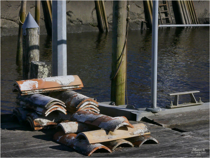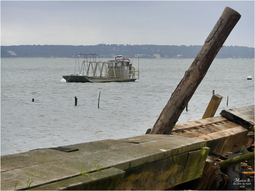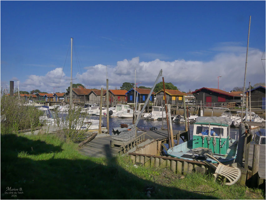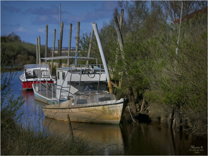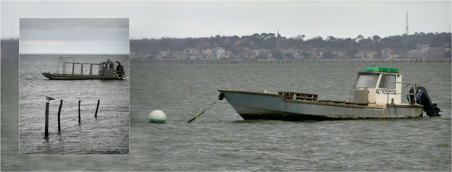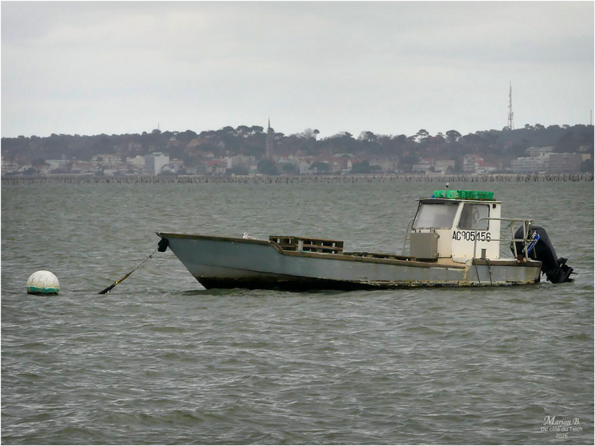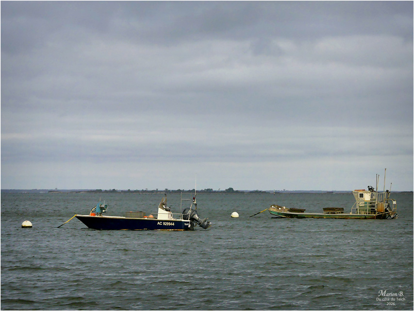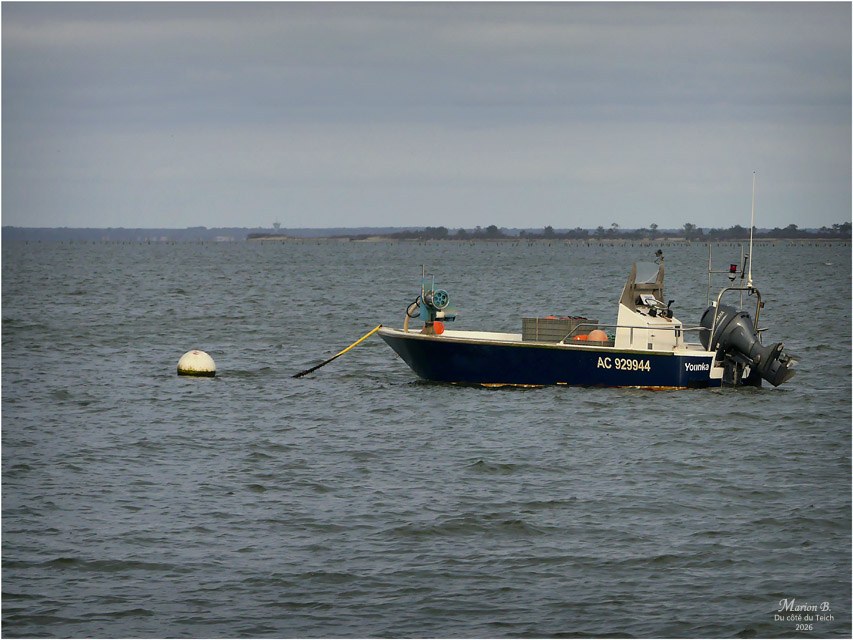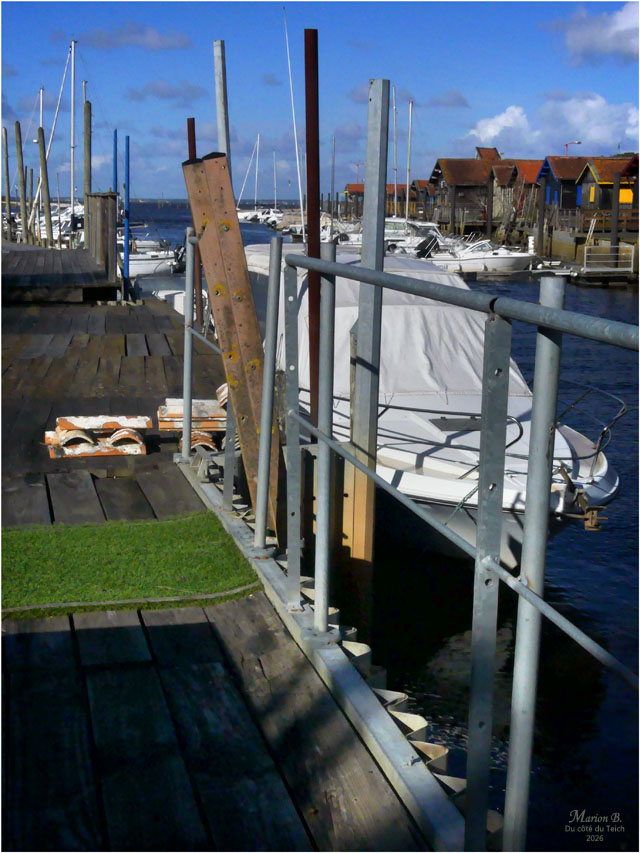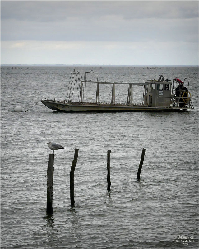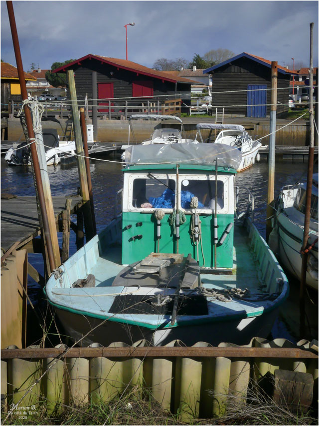 6 Janvier 2026 – C’était le redoux, avec quand-même un petit vent du Nord vivifiant ! Comme assez souvent, je venais d’assister au retour de nombreux bateaux au port, depuis la terrasse d’une cabane à huîtres, entourée de ganivelles.
