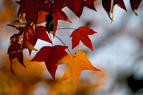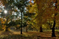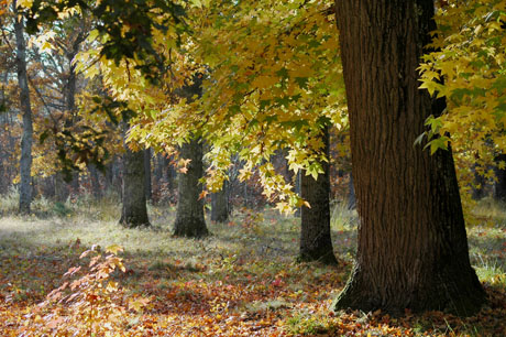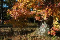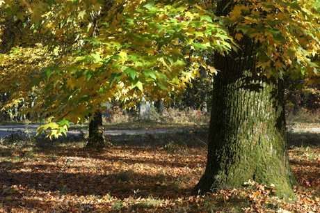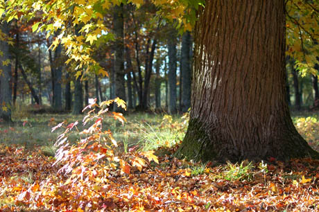 Parmi les parcelles de pins et les champs de maïs, on est surpris de trouver, à une croisée des chemins, un petit bois de chênes d’Amérique et de platanes aux couleurs éclatantes.