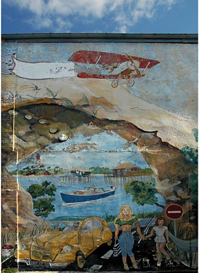 Sur la façade latérale d’une maison du Boulevard de la plage, cette fresque de Michel Hénault, réalisée en 1998, ne manque pas de charme. Je la découvrais seulement aujourd’hui : merci Sylvie !