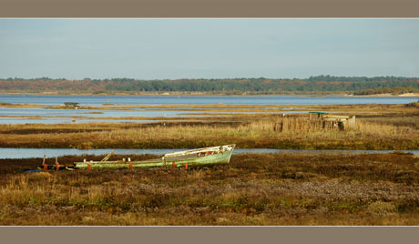 Lundi encore : la lumière du soir, en regardant cette fois vers Audenge et le fond du Bassin. Epave éventrée, vieille plate, tonnes de chasse sans chasseurs, échassiers chassant alors… leurs idées noires !… :razz: