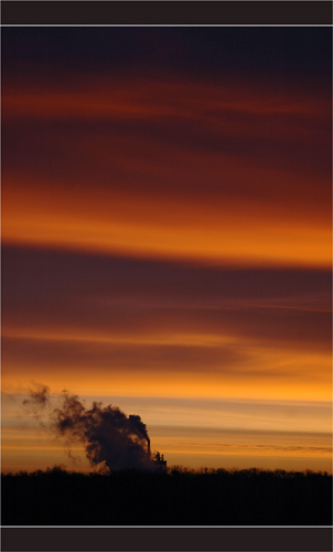 Avant de m’attaquer à « n’importe quoi », voici un compromis : lever de soleil on ne peut plus classique mais sur les cheminées de la seule et unique grosse usine du Bassin : la Smurfit (cellulose du pin), de Facture (Biganos).