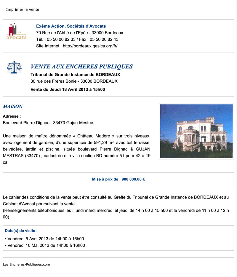 Avril 2013 – lire article Sud-Ouest et voir annonce :