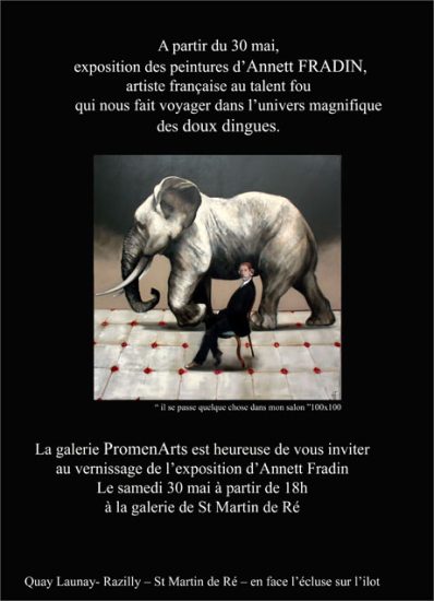 Céleste m’avait communiqué cette affiche, sur l’exposition d’ Annett Fradin qui se tiendra tout l’été à St Martin de Ré (… et l’été s’installe ce week-end !).