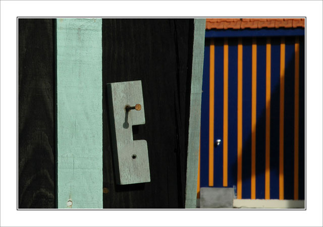Attention, peinture fraîche sur plusieurs cabanes du port de Biganos, et de nouveaux sanitaires d’un jaune et bleu éclatants méritant bien un petit coup de zoom !