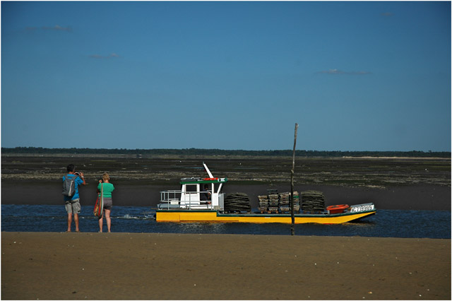 Plate de retour des parcs à huîtres, rivages du port de Larros, cet après-midi.