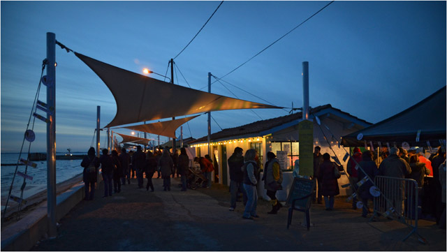 Un succès grandement mérité. Et bien que j’aie préféré, l’an dernier, l’ambiance matinale moins bruyante, je n’ai pas été insensible à la lumière du soir sur la jetée, ni aux illuminations des cabanes et de l’église St Eloi.
