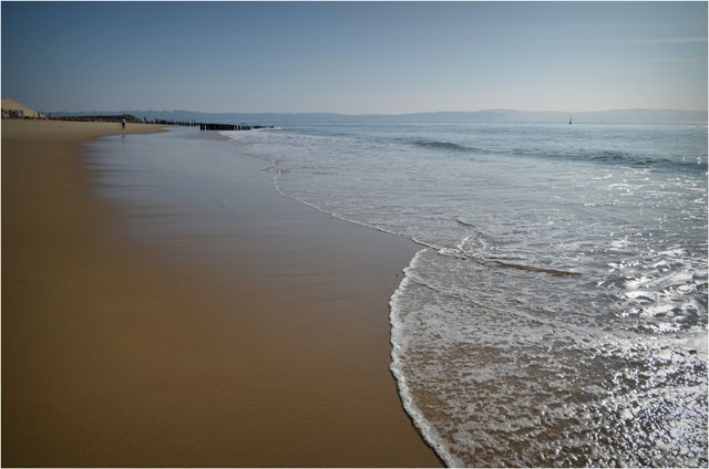 Extrémité Sud-Est de la pointe, face à la dune du Pyla (oyats et épis de bois) :
