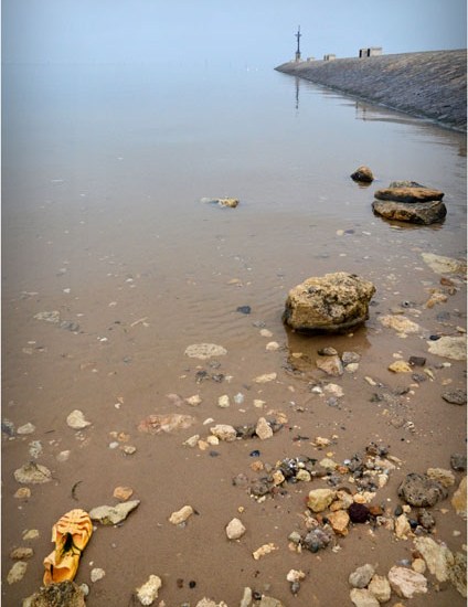 Deux cygnes, une barque à la dérive, une sandale de plage, dans la brume et le crachin, et la marée qui commence à redescendre…