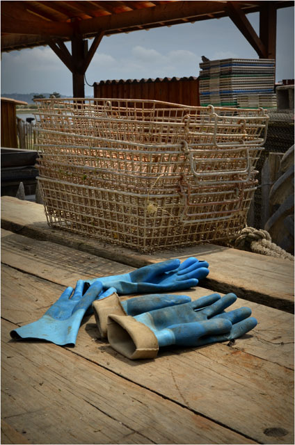 BLOG-DSC_05625-gants bleus et paniers métal sur remorque village Cap-Ferret 2 juin 2011 424 × 640 Le long de la conche, jusqu’au Mimbeau… et retour