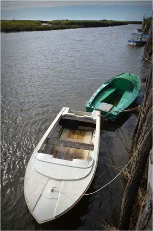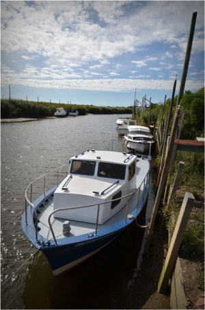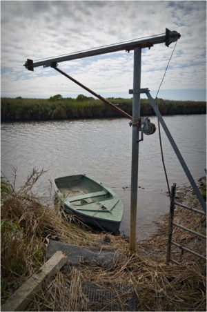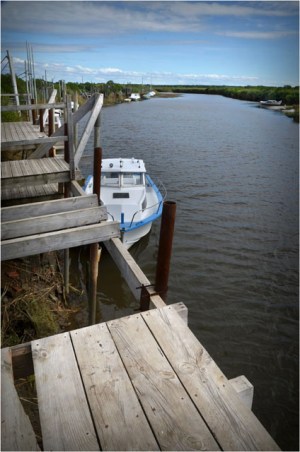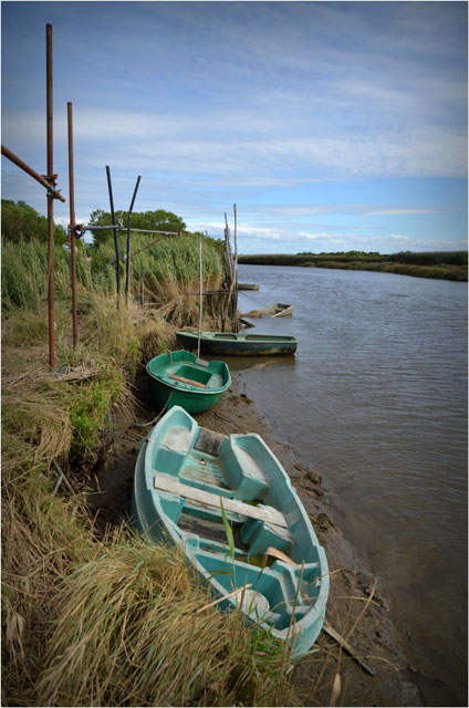 Aux environs du port des Tuiles, voici un coin assez pittoresque : les berges de la Leyre, avec de nombreux pontons et quelques cabanes de bric et de broc.