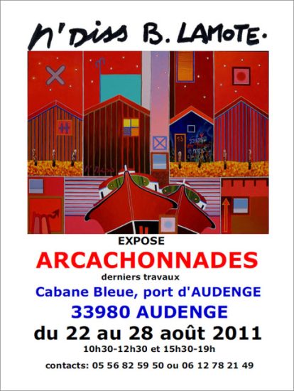 Agenda, actualité, manifestations diverses, Audenge, BASSIN D'ARCACHON Les Arcachonnades de N’Diss B. Lamote à Audenge Marion B.22 août 201113 juin 2025 2 Commentaires (Re)découvrir les oeuvres de N’Diss B. Lamote ooOoo Revoir l’exposition au 6 Bis’Art de la Teste, l’an dernier : clic sur vignette… 44.676402 -1.116117 J’aime chargement…