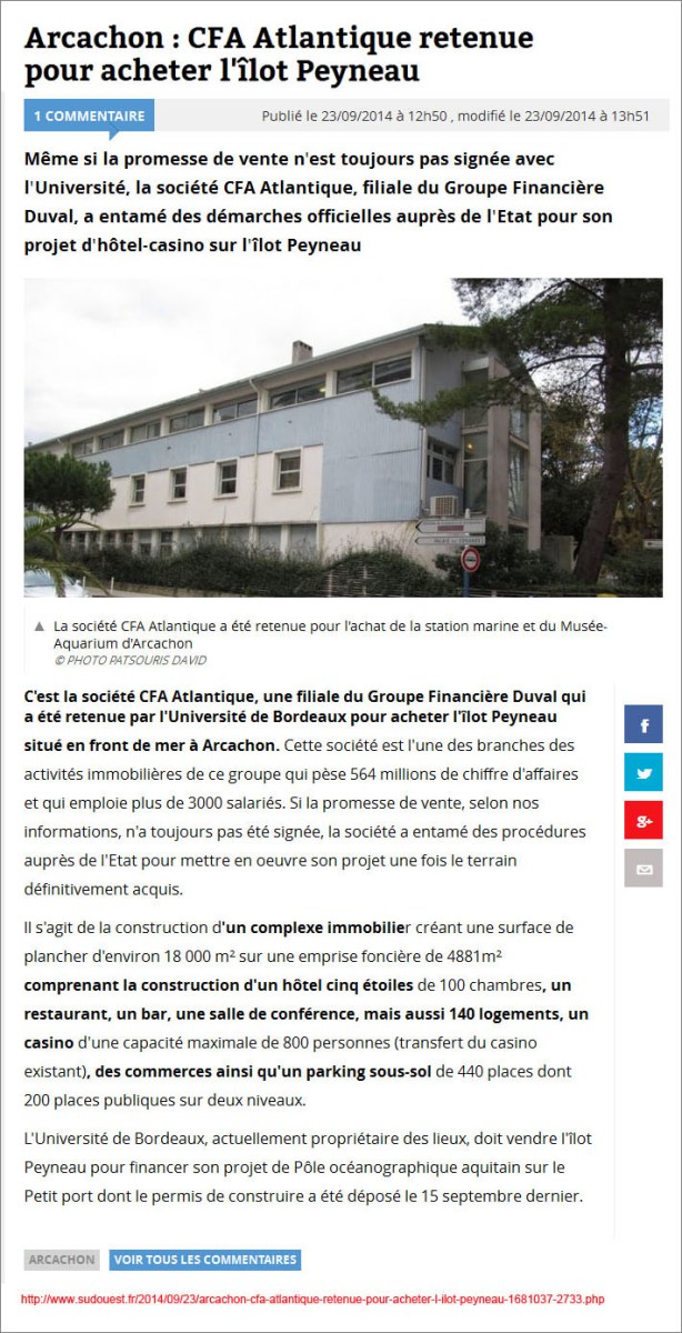 Arcachon – CFA Atlantique retenue pour acheter l’îlot Peyneau – Sud-Ouest du 23 Septembre 2014 23 septembre 2014 711 × 1390 Musée-Aquarium d’Arcachon et POA : des nouvelles du front… de mer