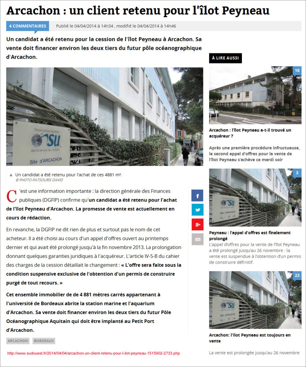 Arcachon – un client retenu pour l’îlot Peyneau – Sud-Ouest du 04 Avril 2014 5 avril 2014 1036 × 1241 Musée-Aquarium d’Arcachon et POA : des nouvelles du front… de mer