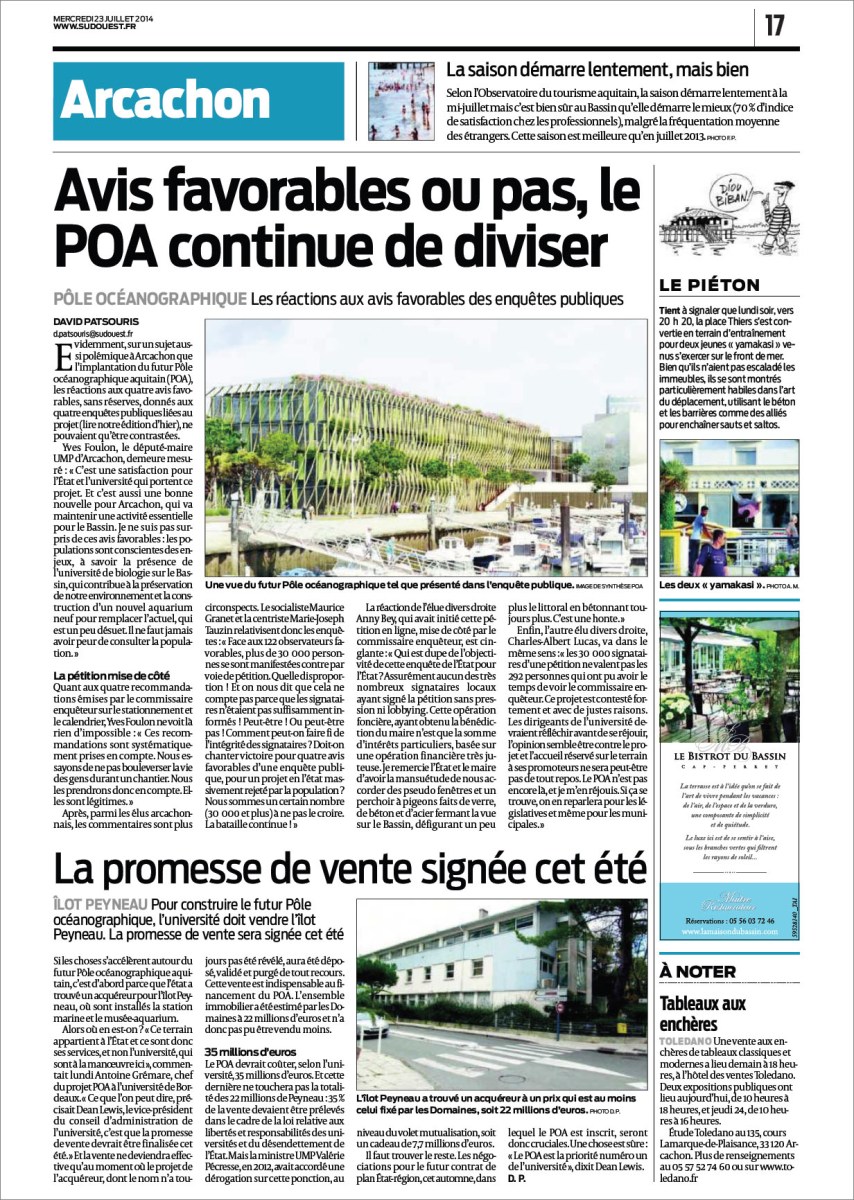 Avis favorables ou pas, le POA continue de diviser – La promesse de vente site Peyneau signée cet été – P17 Sud-Ouest du 23 Juillet 2014 24 juillet 2014 1232 × 1732 Musée-Aquarium d’Arcachon et POA : des nouvelles du front… de mer