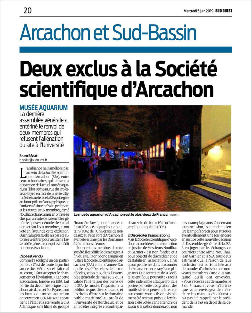 Deux exclus à la Société Scientifique d’Arcachon – Sud-Ouest 5 juin 2019 1200 × 1495 Musée-Aquarium d’Arcachon et POA : des nouvelles du front… de mer