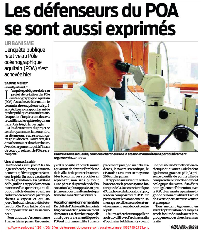 Les défenseurs du POA se sont aussi exprimés – Sud-Ouest du 13 Juin 2014 13 juin 2014 689 × 793 Musée-Aquarium d’Arcachon et POA : des nouvelles du front… de mer
