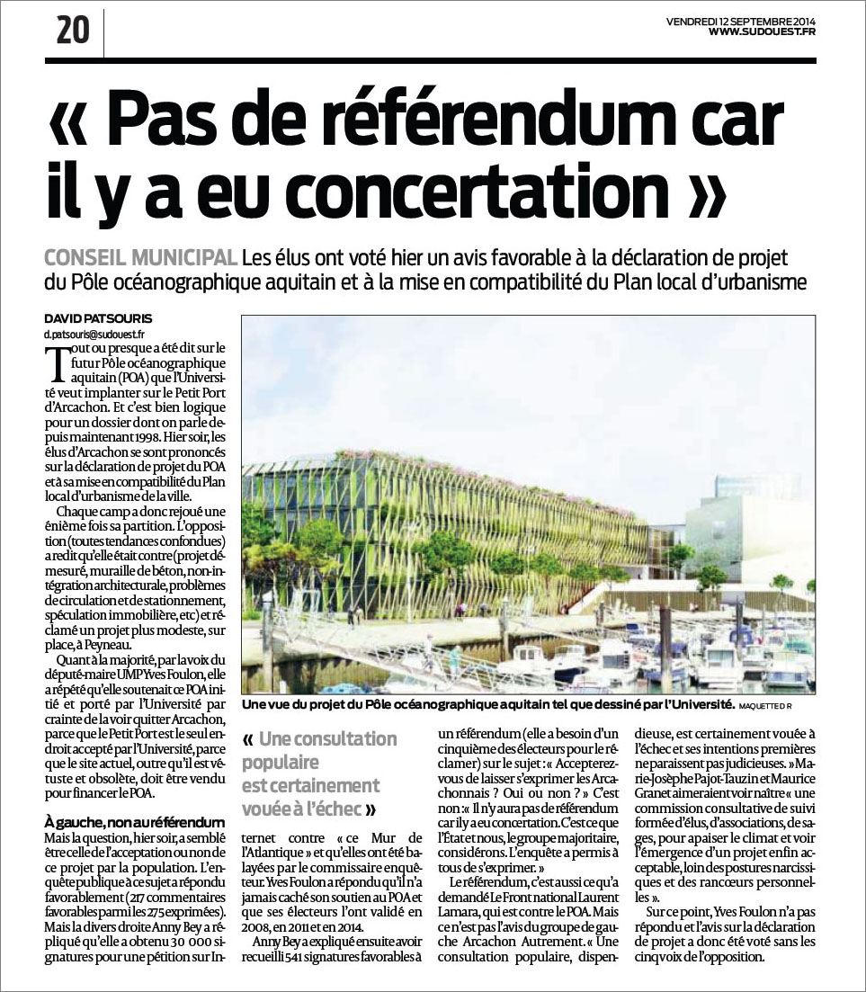 Pas de référendum car ily a eu concertation – Sud-Ouest du 12 Septembre 2014 15 septembre 2014 963 × 1103 Musée-Aquarium d’Arcachon et POA : des nouvelles du front… de mer