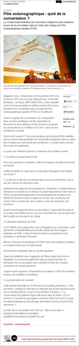 Pôle océanographique – quid de la concertation – – Article Sud-Ouest du 21 Avril 2012 17 Mai 2012 502 × 2184 Musée-Aquarium d’Arcachon et POA : des nouvelles du front… de mer