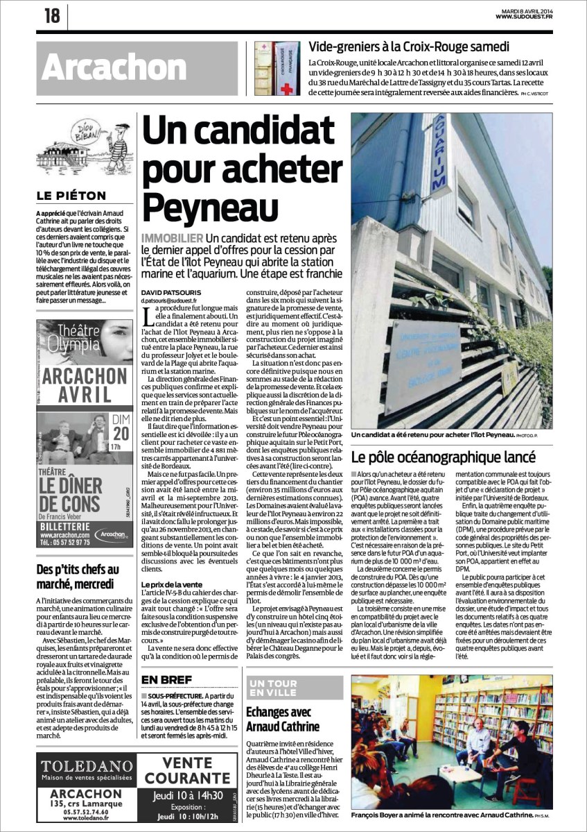 Un candidat pour acheter Peyneau + le POA lancé – Sud-Ouest du 8 Avril 2014 9 avril 2014 1364 × 1932 Musée-Aquarium d’Arcachon et POA : des nouvelles du front… de mer