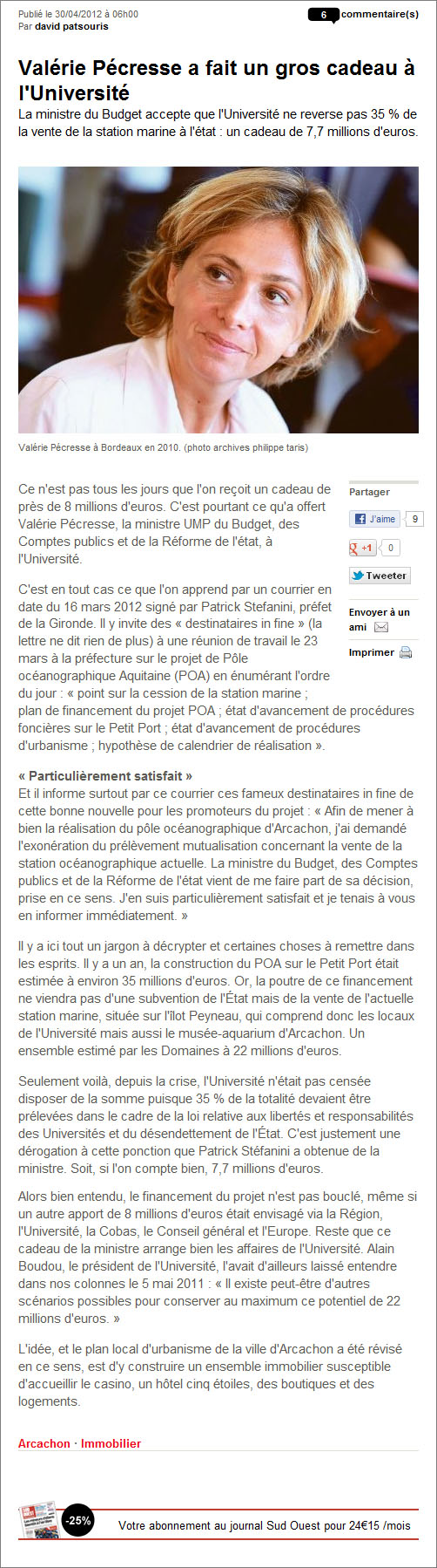 Valérie Pécresse a fait un gros cadeau à l’Université (station marine d’Arcachon) – Sud-Ouest du 30 Avril 2012 17 Mai 2012 502 × 1798 Musée-Aquarium d’Arcachon et POA : des nouvelles du front… de mer