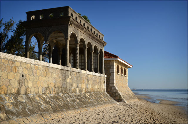 Petite balade sur la plage, entre le vieux port, actuellement en travaux, et le port de plaisance, avec une courte halte devant cet étrange édifice, le « cloître » (fausse ruine de 1911) de la villa Bagatelle où séjourna Toulouse Lautrec.