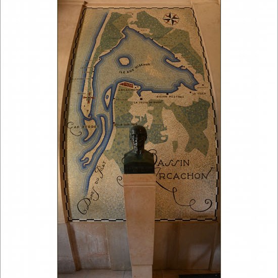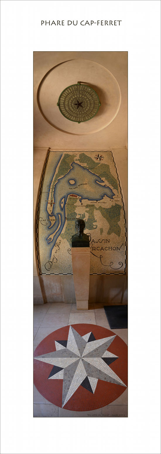 Le phare dénommé à l’origine « Phare d’Arcachon » est construit à partir de 1836 sur la presqu’île du Cap Ferret. Le hall d’entrée est décoré de mosaïques signées du maître verrier Auguste Labouret (1871-1964) représentant le bassin d’Arcachon et la presqu’île du Cap Ferret. Deux bustes de Charles-François Beautemps-Beaupré (1766-1854), père de l’hydrographie moderne, et de Fresnel (1788-1827), physicien, complètent le décor.