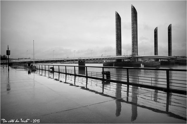 BLOG-DSC_19293-quai des marques et pont Chaban Delmas Bacalan Bastide Bordeaux N&B 29 janvier 2013 640 × 424 Quai des marques : pluie battante sur les pavés !