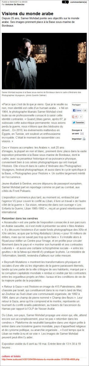 Visions du monde arabe (photos de Samer Mohdad) – Sud-Ouest du 9 Avri 2013 20 avril 2013 482 × 1982 Samer Mohdad expose à la base de sous-marins