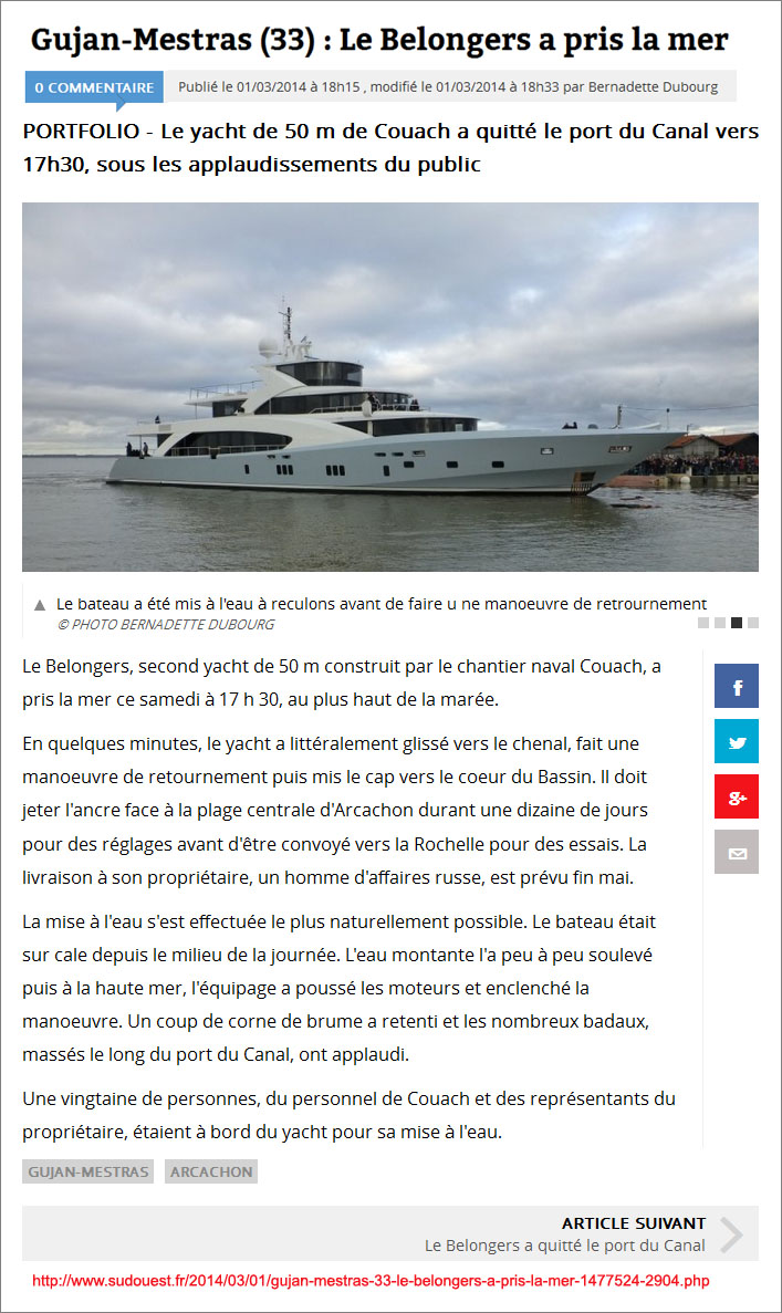Le Belongers a pris la mer – Sud-Ouest fr du 1er Mars 2014 1 mars 2014 707 × 1187 Couach met à l’eau le Belongers, son deuxième yacht de 50 mètres