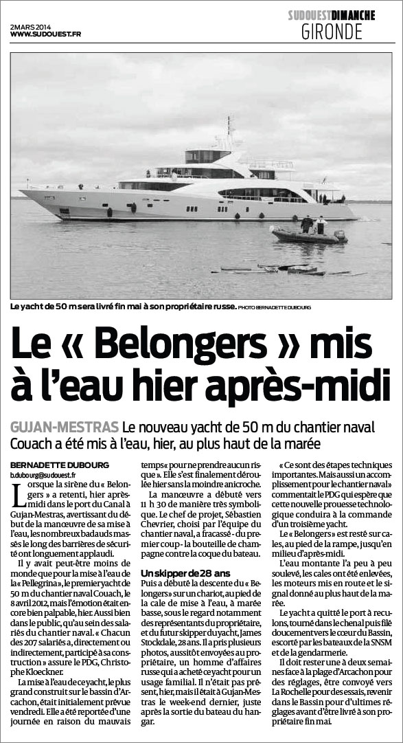 Le Belongers mis à l’eau hier après-midi – Sud-Ouest Dimanche du 2 Mars 2014 2 mars 2014 587 × 1081 Couach met à l’eau le Belongers, son deuxième yacht de 50 mètres