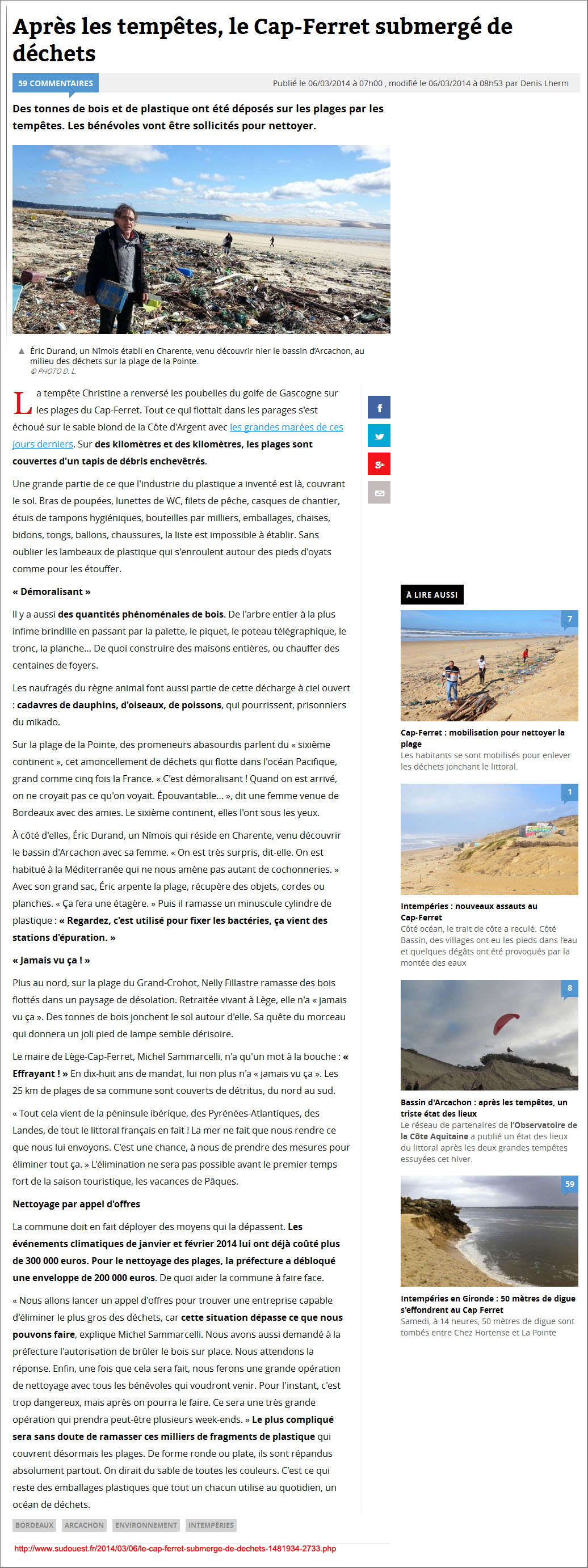 Après les tempêtes, le Cap-Ferret submergé de déchets - Sud-Ouest du 6 Mars 2014clic pour lire