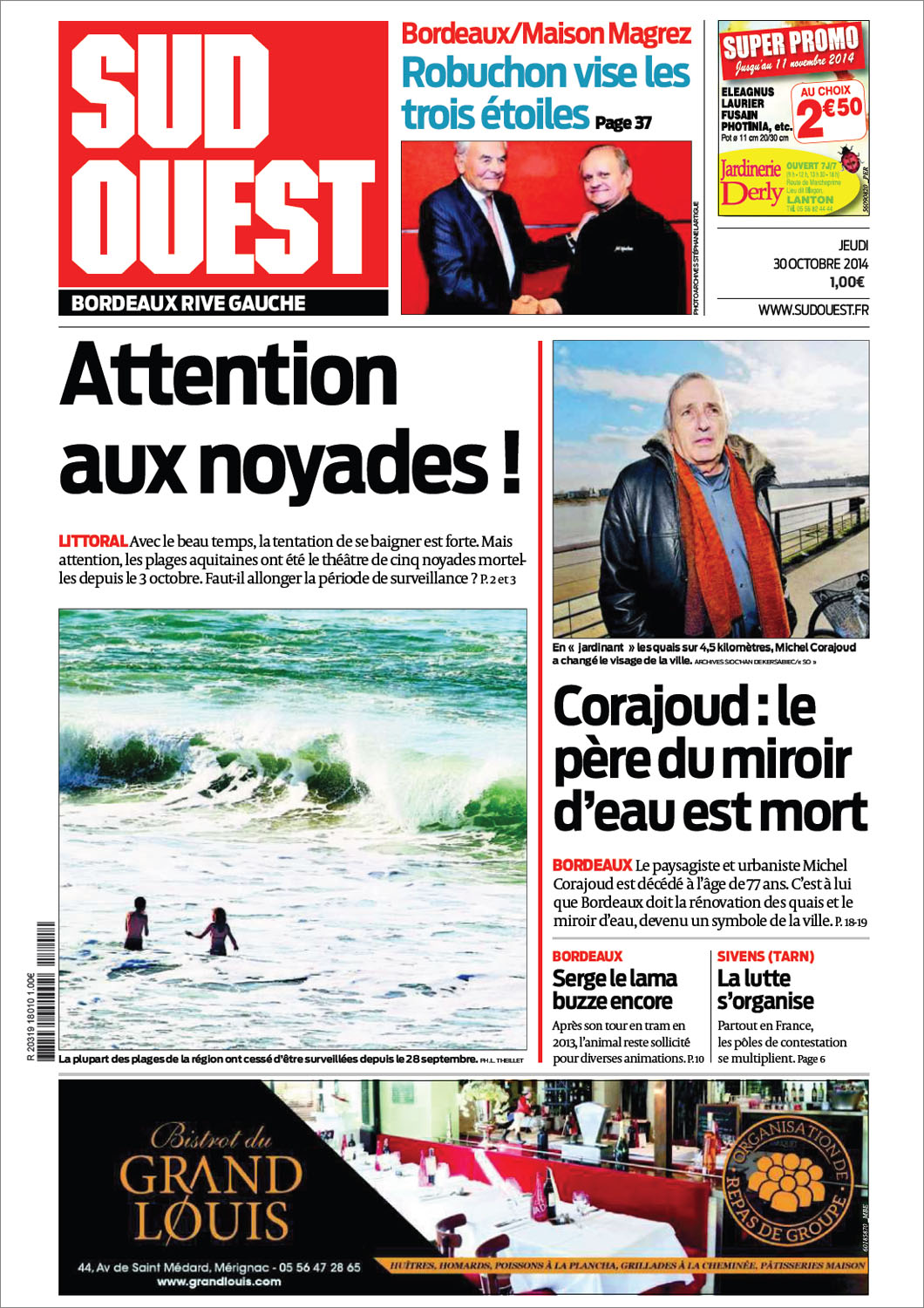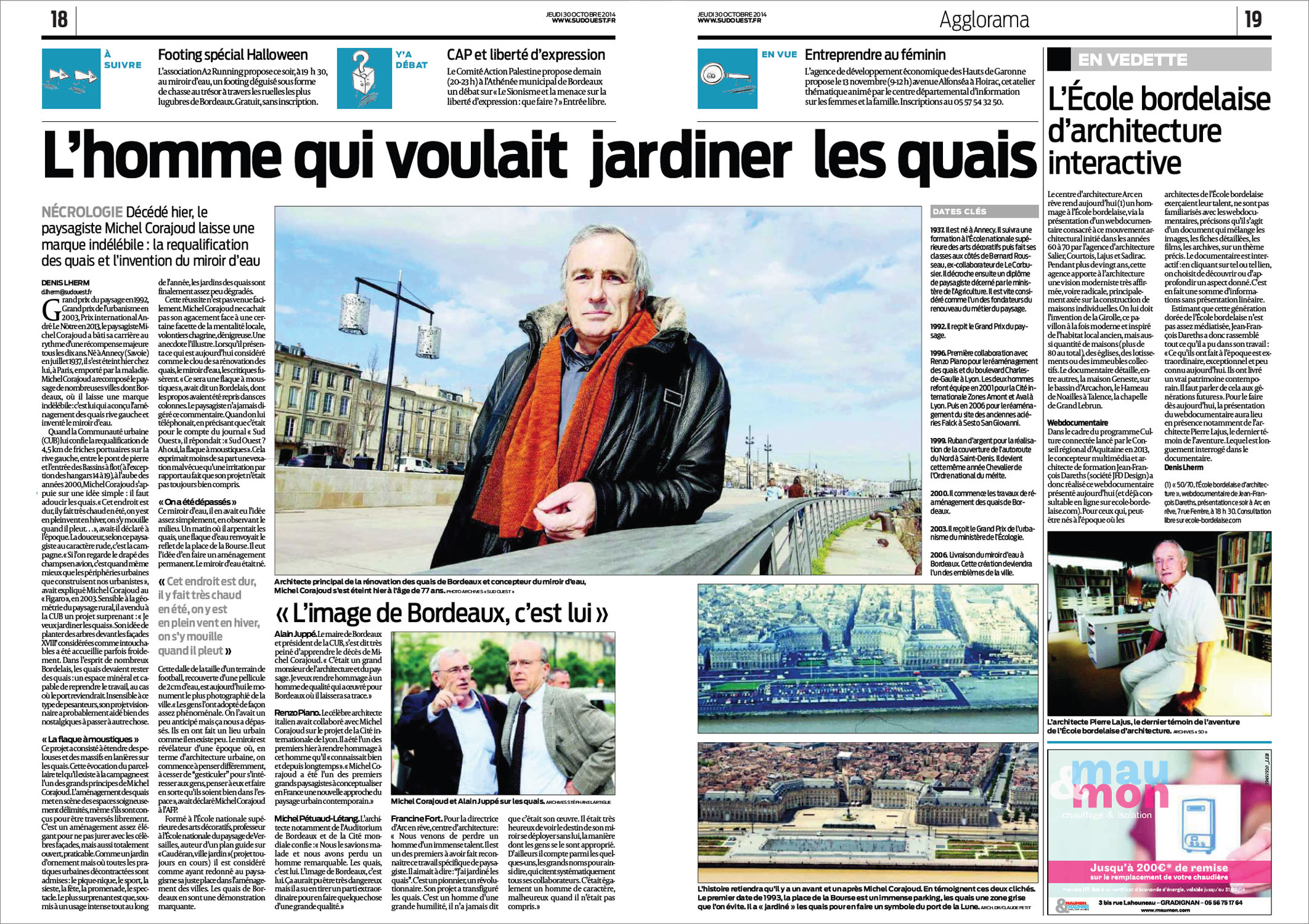 Une Sud-Ouest du 30 Octobre 2014     Michel Corajoud - L'homme qui voulait jardiner les quais - Sud-Ouest du 30 Octobre 2014