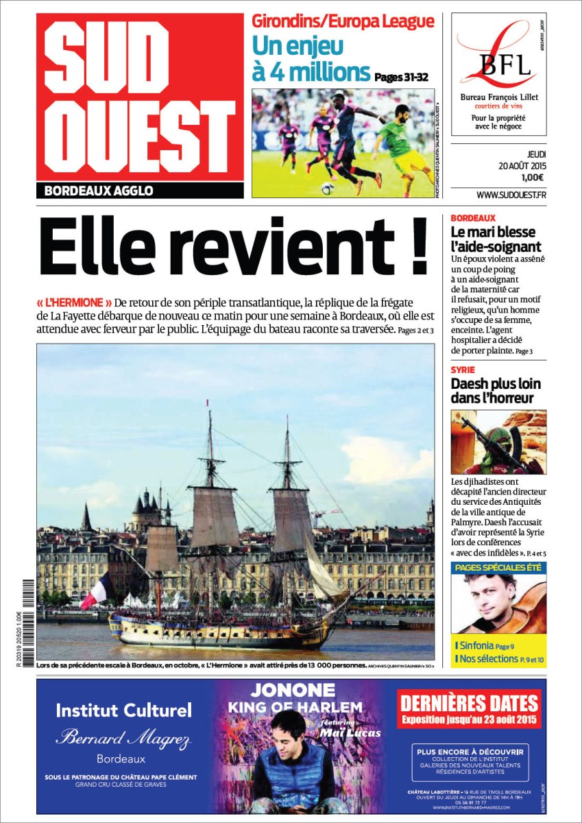 Sud-Ouest 20 Août 2015 – P01 – Hermione 15 septembre 2015 1105 × 1562 L’Hermione : le retour d’Amérique !