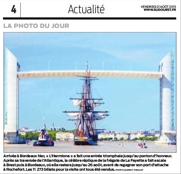 Sud-Ouest 21 Août 2015 – P04 – photo du jour 15 septembre 2015 603 × 580 L’Hermione : le retour d’Amérique !