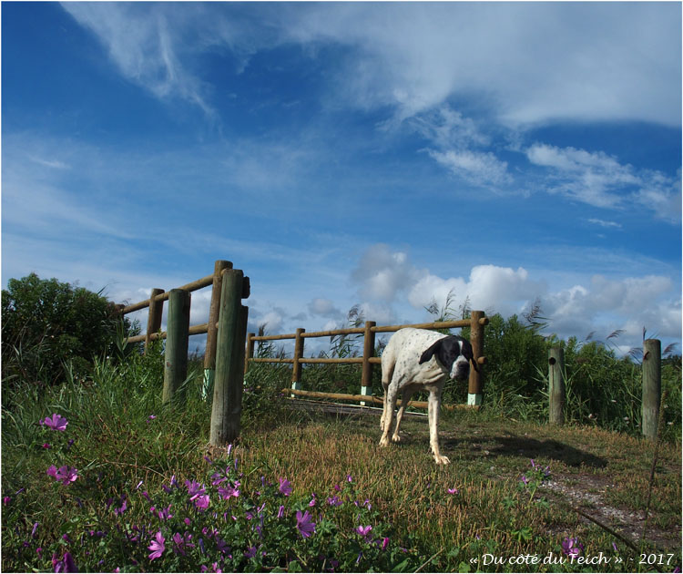Juste quelques matelots occupés à bichonner leurs bateaux, des promeneurs à bicyclette, venus contempler la Leyre, et la visite amicale d’une vieille connaissance, intriguée par mon appareil-photo posé au ras des fleurettes !