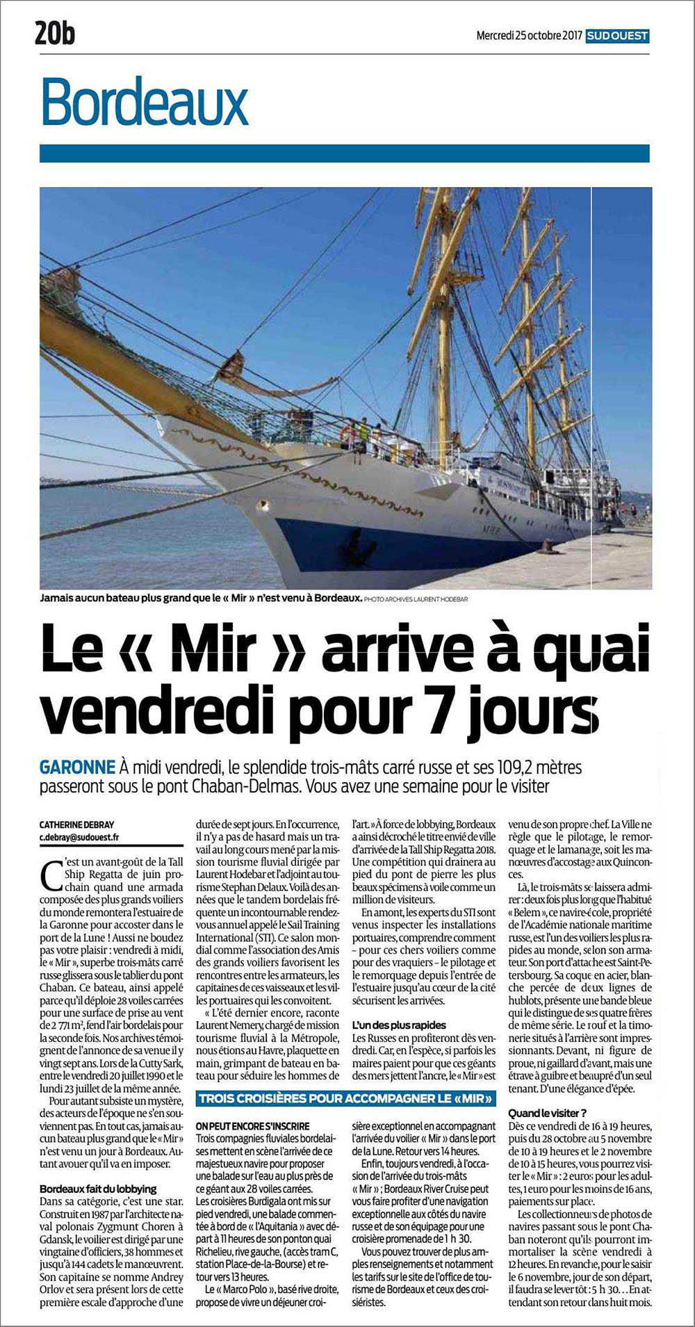 Article Sud-ouest du 28 Octobre 2017 : L'un des plus grands voiliers du monde, le trois-mâts russe "Mir" fait escale aux Quinconces.