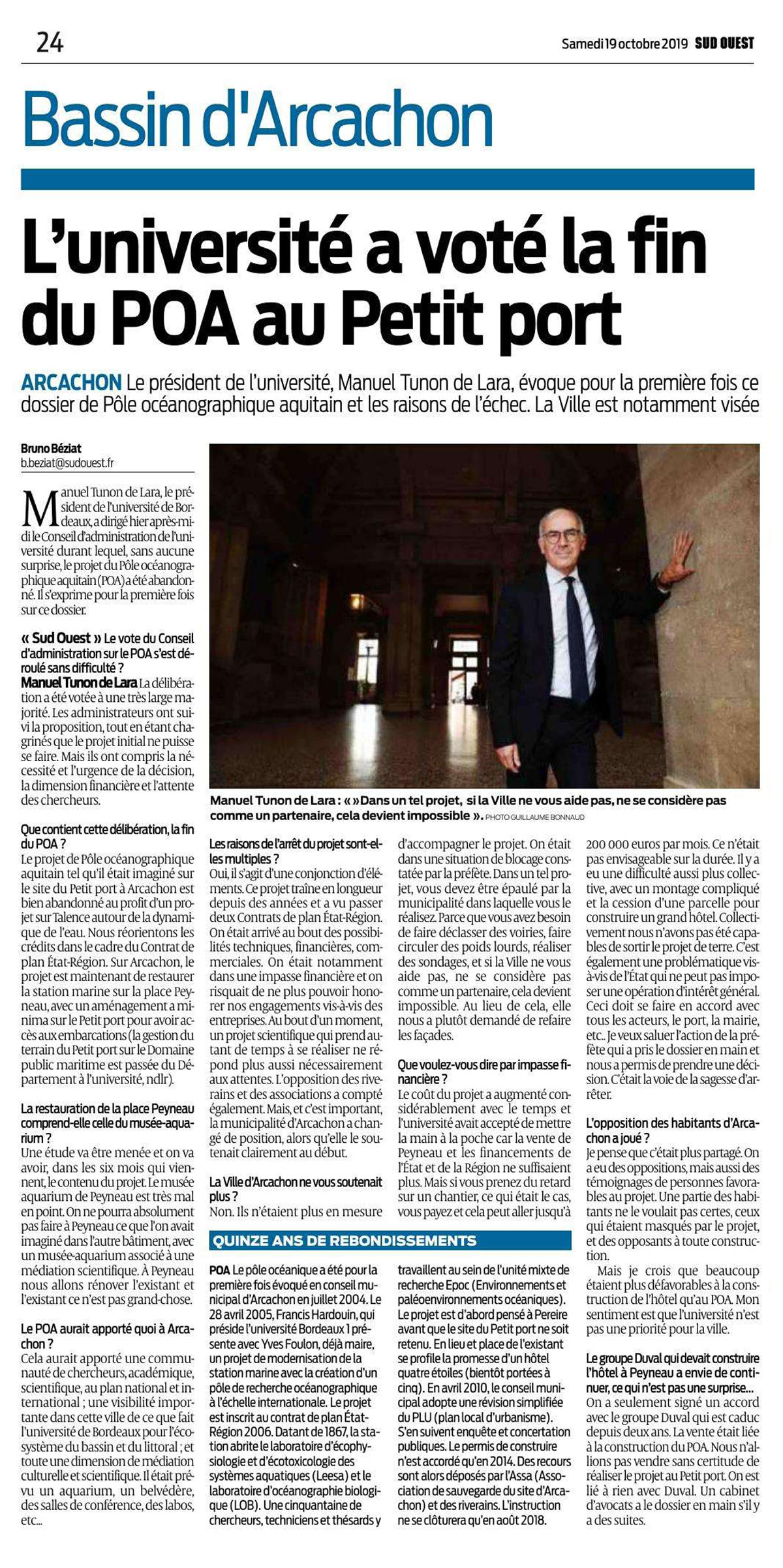 sud-ouest du 19 oct 19 - l'université a voté la fin du POA au petit port
