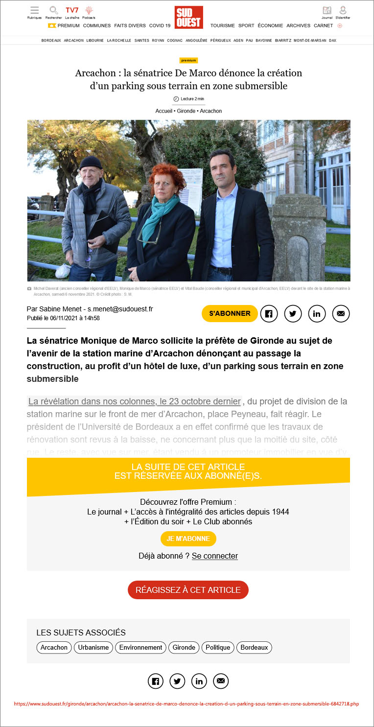 Comme vous le savez, l’Université qui n’a pas pu construire le POA au petit port d’Arcachon, envisage de vendre la moitié de terrain où se situent la station marine et le musée-aquarium au promoteur qui avait déjà élaboré ce projet « K »olossal (!!) d’hôtel 5 étoiles avec parking souterrain. Offensive de la sénatrice EELV qui rappelle que la zone est submersible !!
