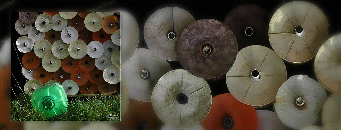 Un peu de fantaisie, sous une éclaircie ! Des collecteurs à coupelles (pour naissains d’huîtres), plus souvent photographiés de profil, et dont j’ai aimé cette fois-ci les couleurs et le motif 70’s !!