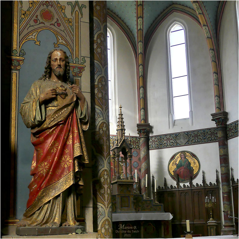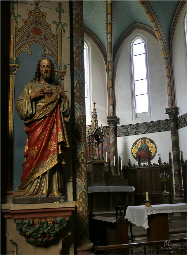 La « nouvelle église » orientée Nord-Sud est située à l’emplacement de l’ancienne qui était, elle, orientée Est-Ouest selon la tradition.