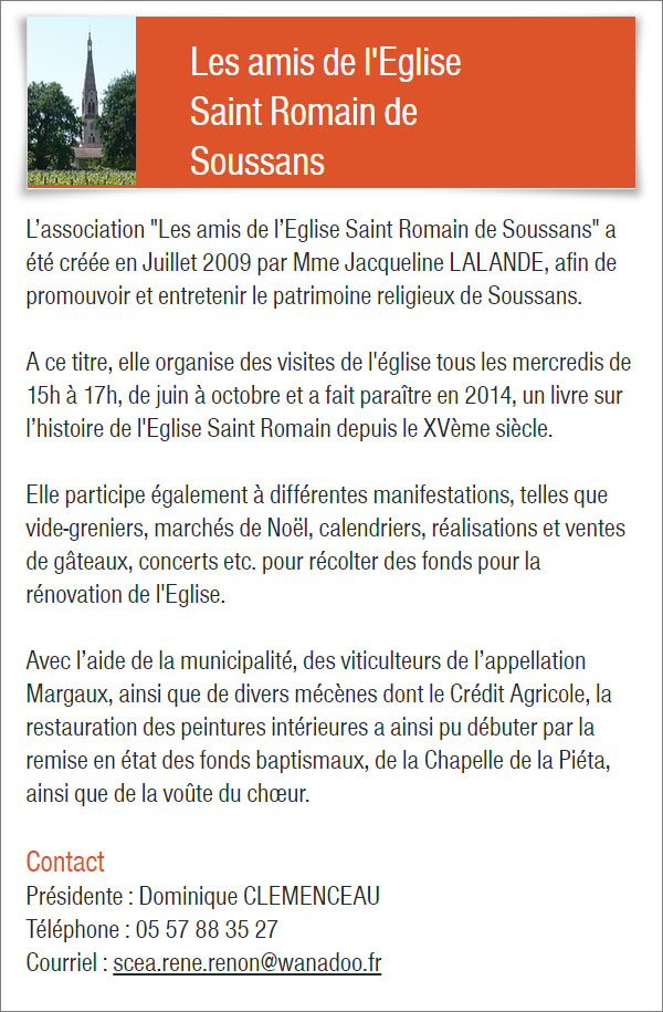 L’association les Amis de l’Eglise Saint Romain de Soussans veille à la promotion et à l’entretien de ce patrimoine religieux et les travaux de restauration se poursuivent (voir ci-dessous) avec notamment les vitraux du choeur.