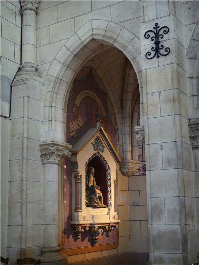 Les seuls vestiges de l’ancienne église que l’on a pu conserver sont une crucifixion en albâtre et une remarquable Vierge de Pitié. Celle-ci, en chêne polychrome, remonte au début du XVIème siècle. Elle a été cachée à la Révolution, puis a retrouvé sa place dans la nouvelle église en 1888.