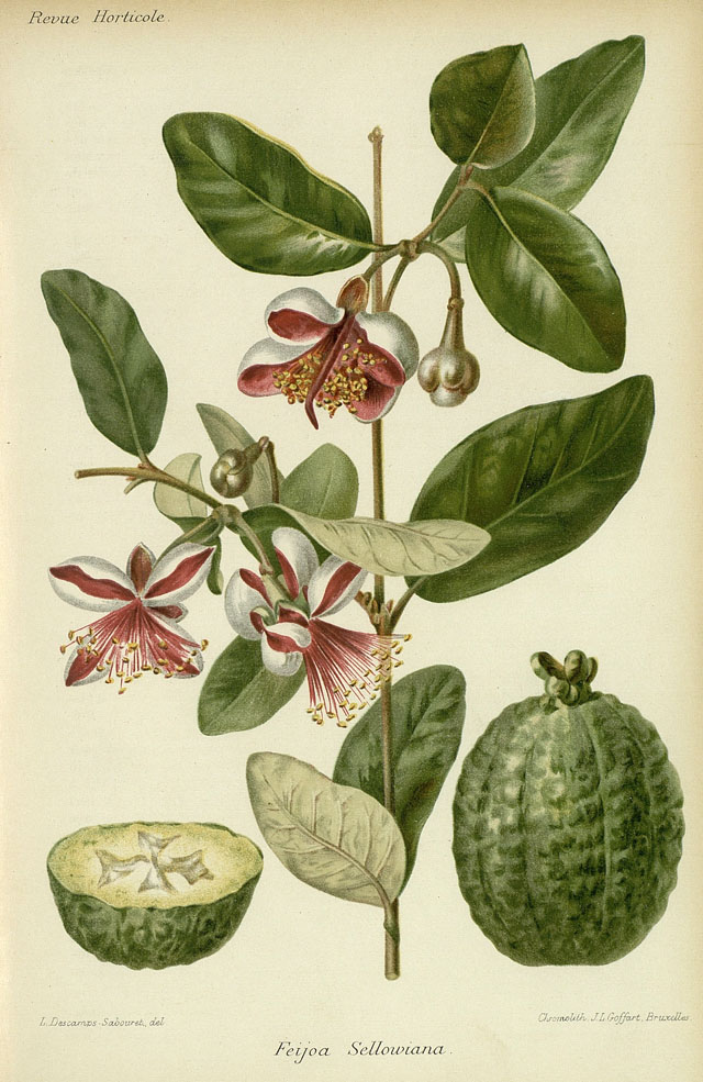 Les fruits, appelés feijoas, goyaves ananas, goyaves du Brésil ou goyaves de Montevideo, ont la forme d’un kiwi vert et sans poils, avec une peau rugueuse verte qui le reste même à maturité. La pulpe est granuleuse à pépins avec un goût légèrement acidulé et un arôme délicieux rappelant l’ananas, la goyave et la fraise. La chair est riche en vitamine B et en vitamine C.