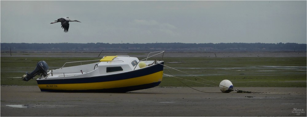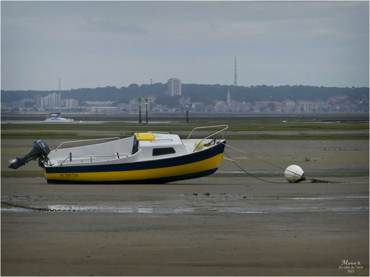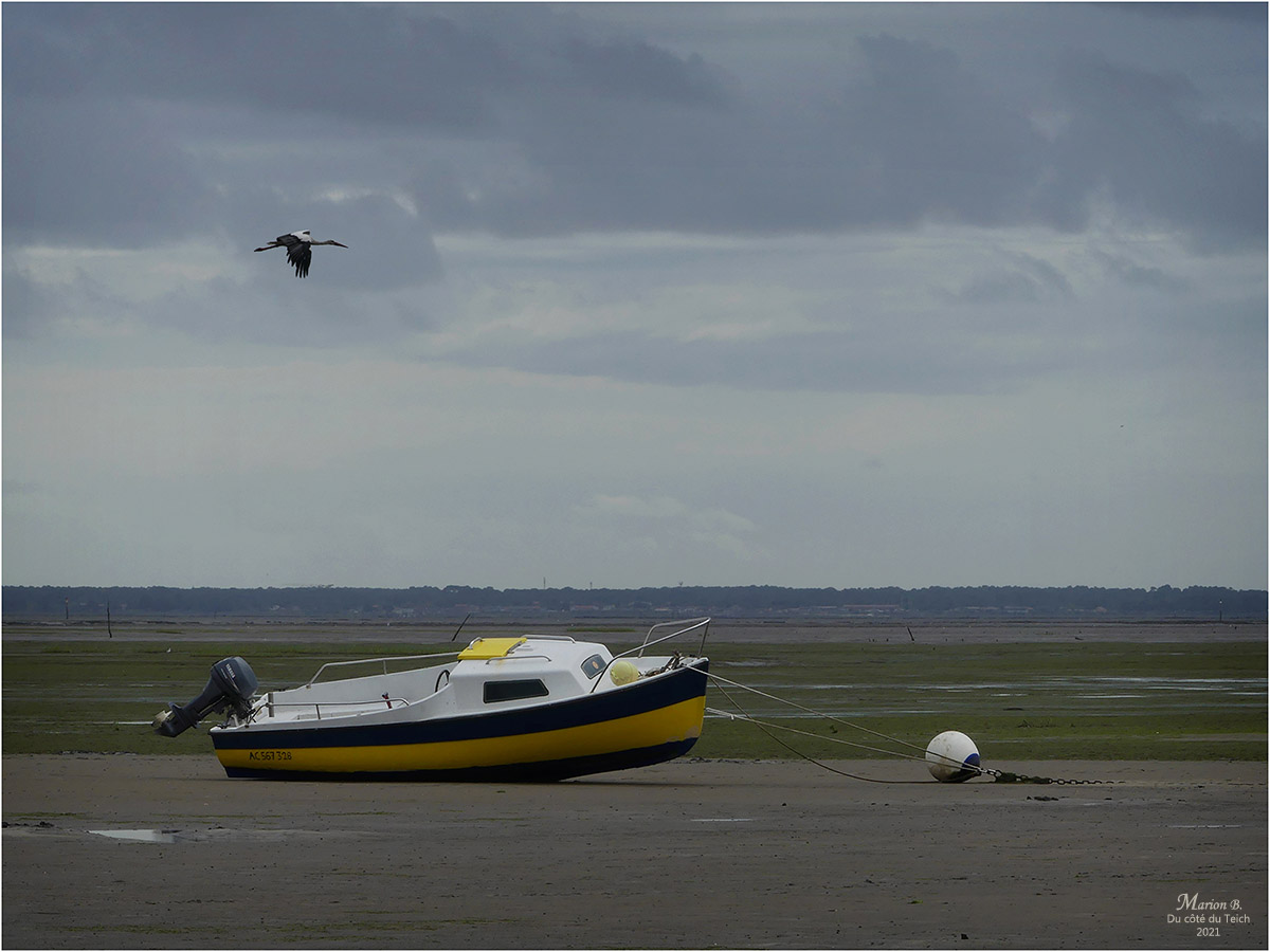 Je photographiais paisiblement un bateau sur la mer d’Aral le Bassin à marée basse, en pestant tout de même contre cet affreux moteur et quelques tours disgracieuses d’Arcachon…