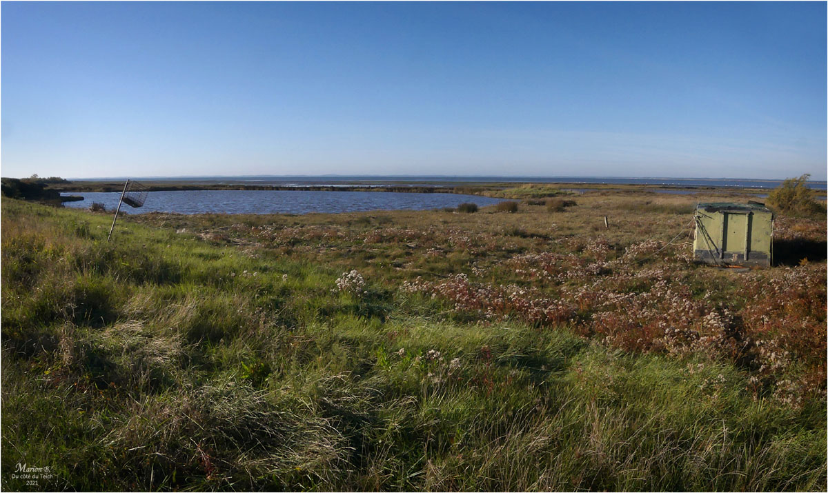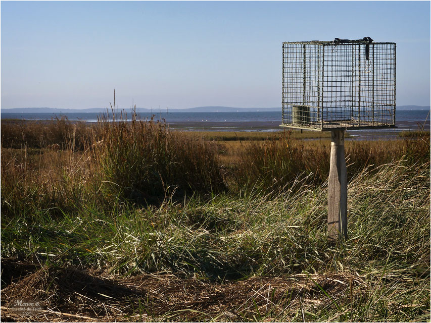 Un beau dimanche d’été indien et de vacances de Toussaint sur le sentier du littoral. Les promeneurs sont nombreux, pas l’ombre d’une palombe (non, ça c’est pour la rime !) d’un canard ou d’un chasseur autour de la tonne de chasse et de la cage à appelant.