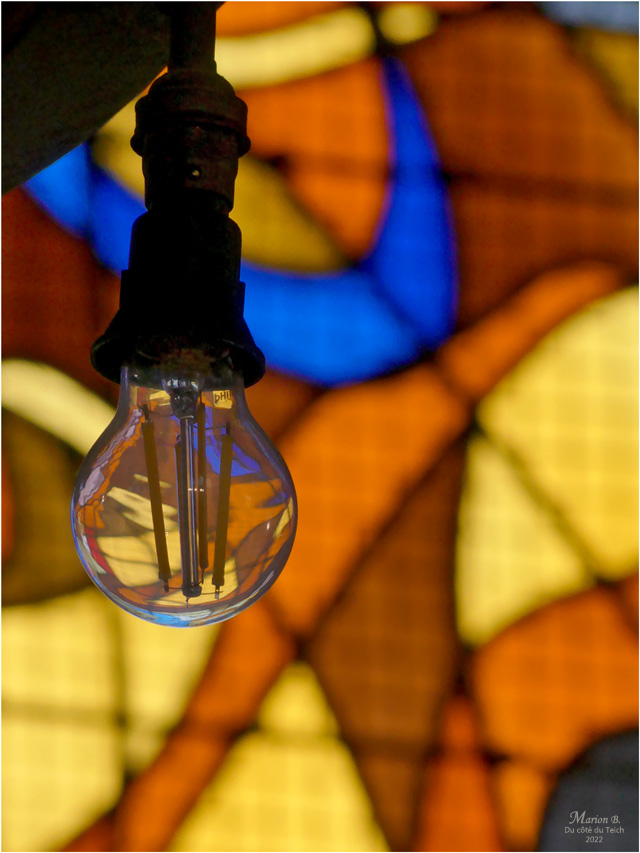Il fallait y penser à attraper une ampoule devant un vitrail, jolies couleurs et rendu.