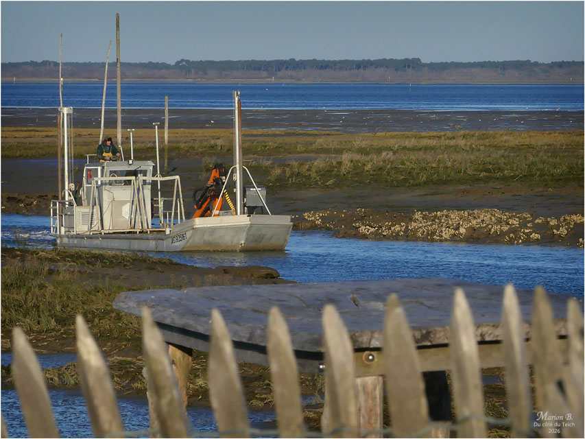 6 Janvier 2026 – C’était le redoux, avec quand-même un petit vent du Nord vivifiant ! Comme assez souvent, je venais d’assister au retour de nombreux bateaux au port, depuis la terrasse d’une cabane à huîtres, entourée de ganivelles.