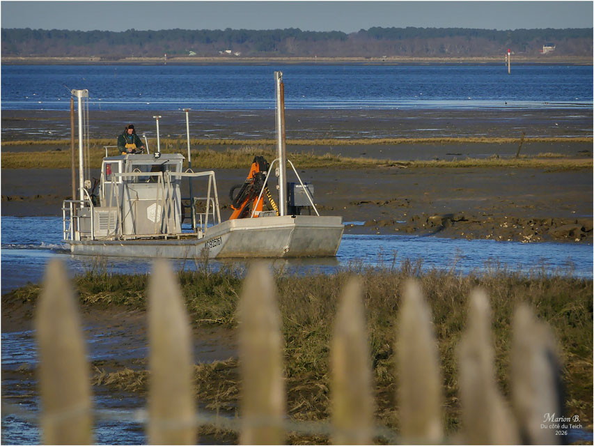 6 Janvier 2026 – C’était le redoux, avec quand-même un petit vent du Nord vivifiant ! Comme assez souvent, je venais d’assister au retour de nombreux bateaux au port, depuis la terrasse d’une cabane à huîtres, entourée de ganivelles.