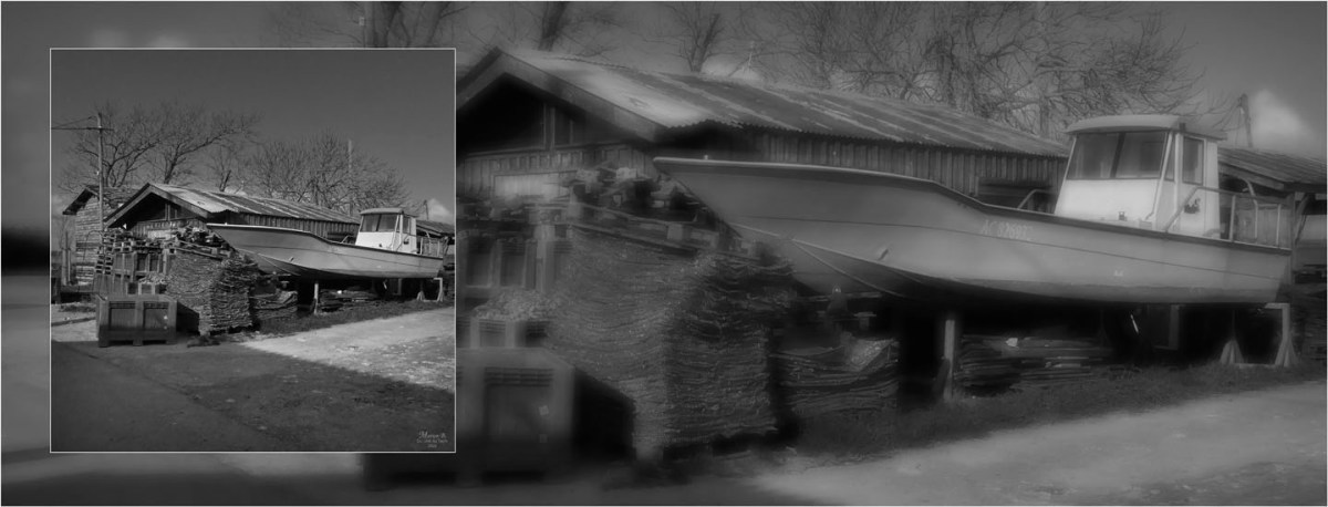 BLOG-P1300972-bannière floue port Barbotière N&B 28 février 2026 1440 × 550 Sujet « bateau », + cabane et lycée